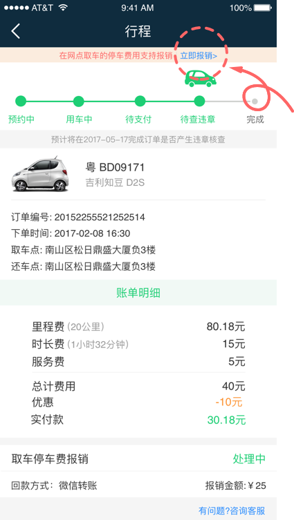 - 您可以登录微信端“立即用车”页面,在还车完毕三天内,进入“订单详情”页面,还可以报销停车费: